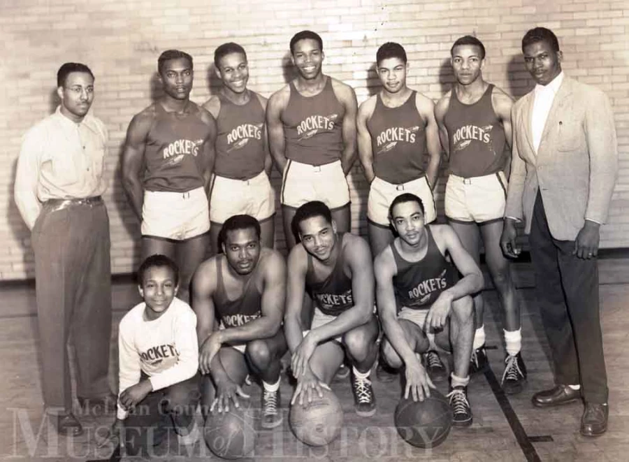 The Rockets were an informal team connected to the Twin-City Recreation Center, 318 S. Main St., Bloomington. They played games Friday night at the old Jefferson School. Reggie Whittaker (far left) was the head coach, and Willy Tripp (far right) his assistant.