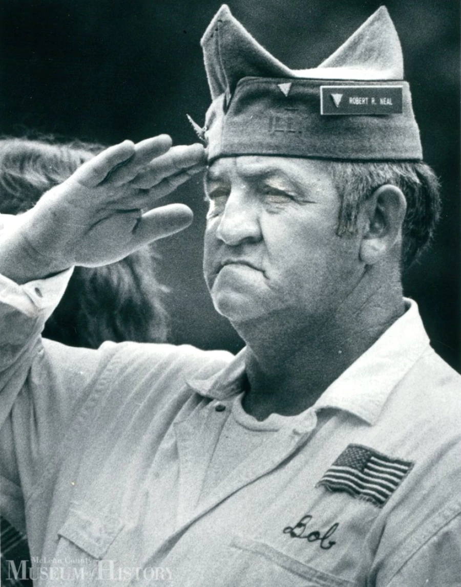 Robert R. “Bob” Neal salutes a fallen veteran at Bloomington’s Park Hill Cemetery, Memorial Day 1982. Bob served in the U.S. Marine Corps and was a veteran of the Korean War, and once back in Bloomington became members of both the Louis E. Davis American Legion Post and the John H. Kraus VFW Post. Bob, who drove a truck for Ozark General Store General Grocery Co. of Illinois for 30 years, passed away at the age of 64 in December 1993.