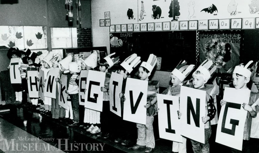Towanda Grade School kindergartners perform Thanksgiving themed poems and songs for their parents the week of Thanksgiving 1980. Although 1980 may not seem all that long ago to some of us, these five-year-old are now past or nearing the “Big Four O!”