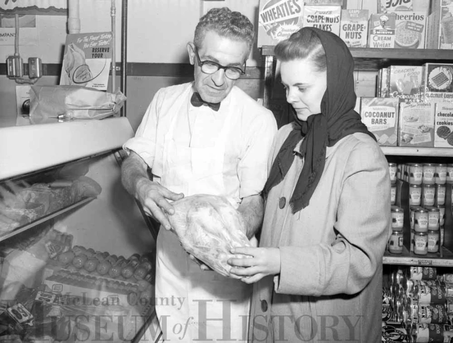 Ed Peifer of Peifer’s Madison Market, 220 N. Madison St. in downtown Bloomington, shows an unidentified shopper the finer points of the Thanksgiving turkey in this late November 1952 photograph.