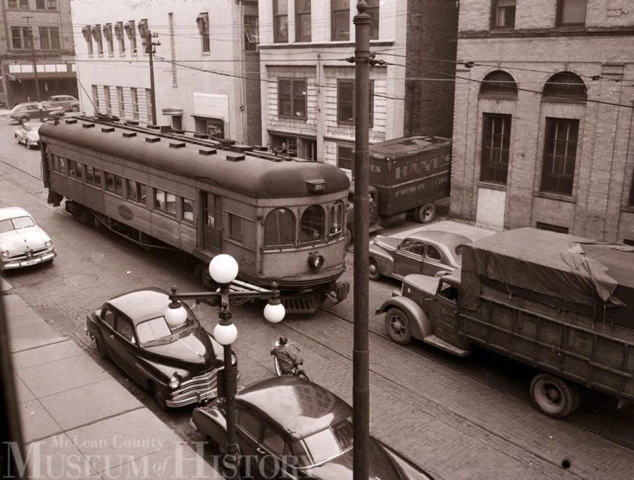 This September 1950 scene shows an Illinois Terminal Railroad car trundling past the 200 block of North Madison Street in downtown Bloomington. Illinois Terminal is often misidentified as a city streetcar system. In fact it was an electrified light rail network connecting many Central Illinois communities to each other and St. Louis. Bloomington lost interurban service in February 1953.