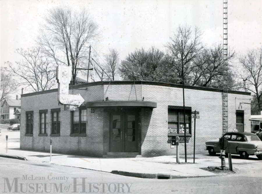 “A feeling of sadness that only bus stations have” Jack Kerouac mused in his 1957 novel “On the Road.” Well, we’re pretty sure that Kerouac, in all his riotous travels, never passed through Bloomington’s gone-but-not-forgotten Depression-era station! Located at the northeast corner of East and Douglas streets on the north end of downtown, this station opened on April 1, 1939. The one-story tan brick structure, built in the Streamline Moderne-style popular at the time, included waiting rooms, ticket office, and restrooms. By 1956, the date of this photograph, the station served Greyhound Bus Lines, Illini Coach Co., Peoria Rockford Coach Line, and the local Yellow Cab Co. There was also a lunch counter restaurant to grab a bite to eat.Illini Swallow Bus Lines Inc. was the last carrier to make use of the station, which closed for good on October 17, 1997. The old building was then razed sometime afterward and the site is now part of Lincoln Park, the “front lawn” of the Bloomington Center for the Performing Arts.