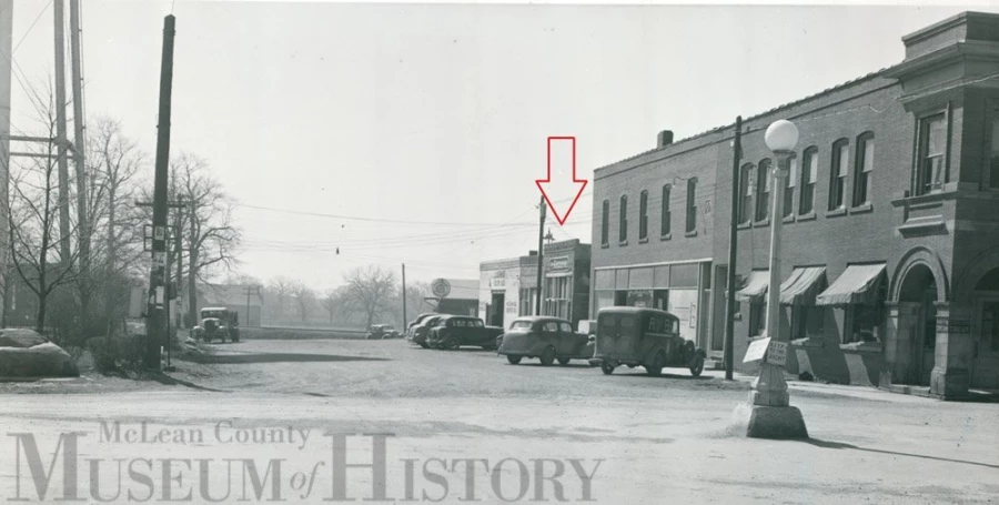 Seen here is a section of downtown Saybrook in the spring of 1941. The view is from the intersection of West Lincoln and South Center streets, looking south down Center Street. The rail line barely visible in the background is the Nickel Plate Road (formerly the Lake Erie & Western and today Norfolk Southern). The water tower is still located to the left (or east) of this view. The red arrow points to the Saybrook Gazette newspaper office. We’d like to hear from current or former Saybrook residents to tell us what else they see here.