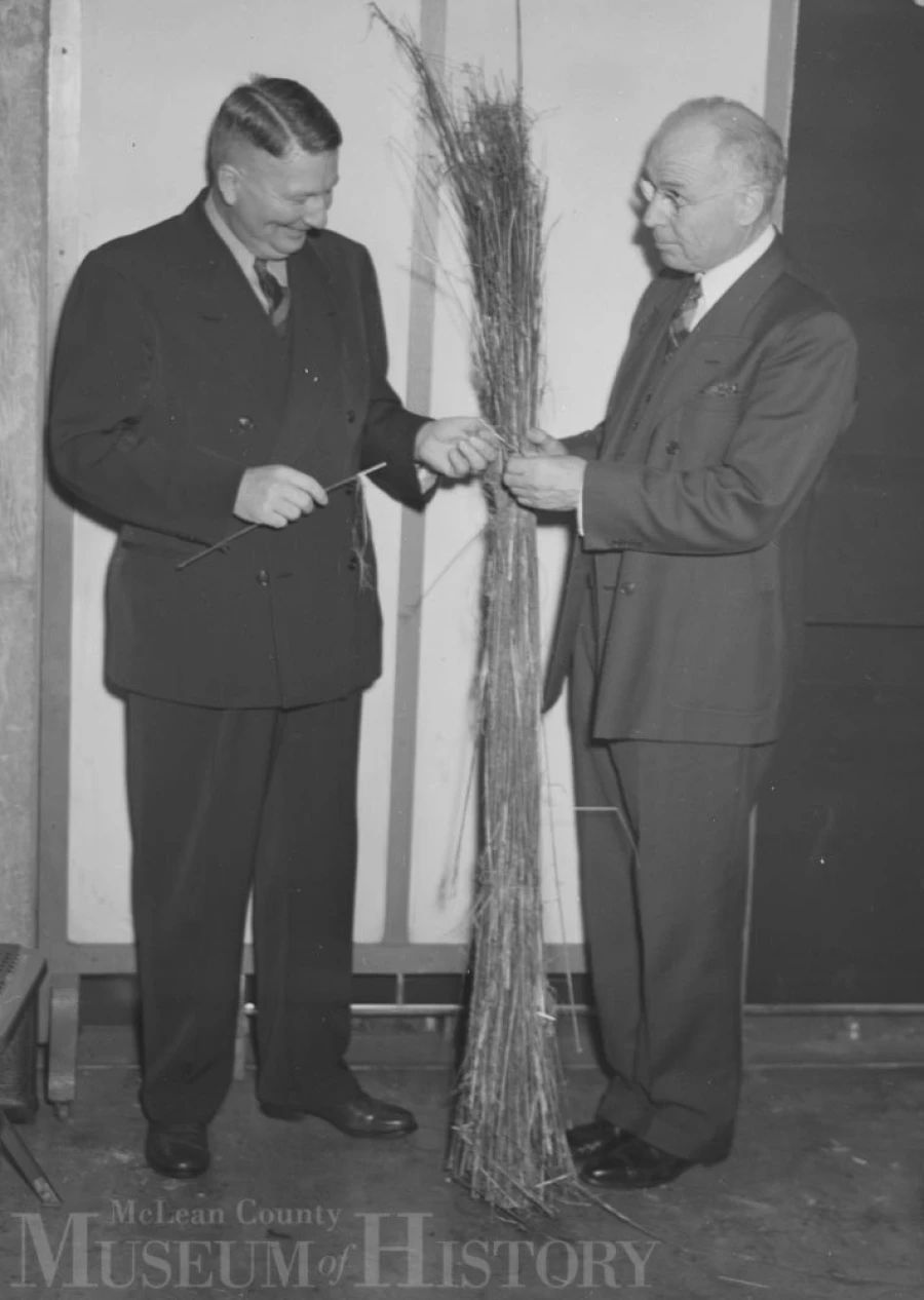 In late November 1942, during World War II, farm advisers and agriculture officials from Central Illinois gathered in Bloomington to hear about the importance of growing hemp for the war effort. That’s right, industrial hemp was needed to make rope and other things, such as harnesses and shroud lines for airborne troops. Seen here exhibiting hemp “straw” at the November 23 meeting are J. Francis Buck (left) of the Illinois Agricultural Adjustment Agency (AAA) and Dr. W.L. Burlison of the University of Illinois.By the summer of 1943 there were more than 235 farmers in northern McLean County with a total of more than 4,000 acres of hemp in cultivation. And Lexington would become home to one of 42 hemp mills built by the federal government during the war. One local AAA representative suggested the propaganda slogan, “Hemp to Hang Hitler.” Whoa indeed.