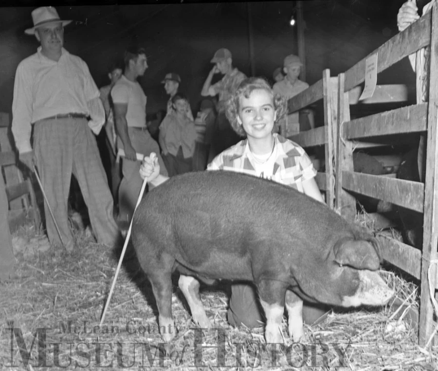 Seen here is Delores Moser of Roanoke with her Poland China barrow (“barrow” being a castrated male swine) judged Woodford County grand champion of all breeds. This photograph was taken on the opening day of the 1950 Woodford County 4-H Fair.What’s your favorite fair time memory?