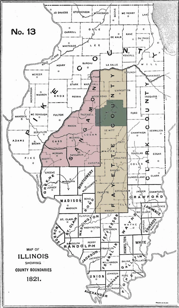 McLean County was part of Sangamon and Fayette counties in 1822. As more settlers arrived and Blooming Grove was established, residents advocated for a closer county seat and voting precinct.