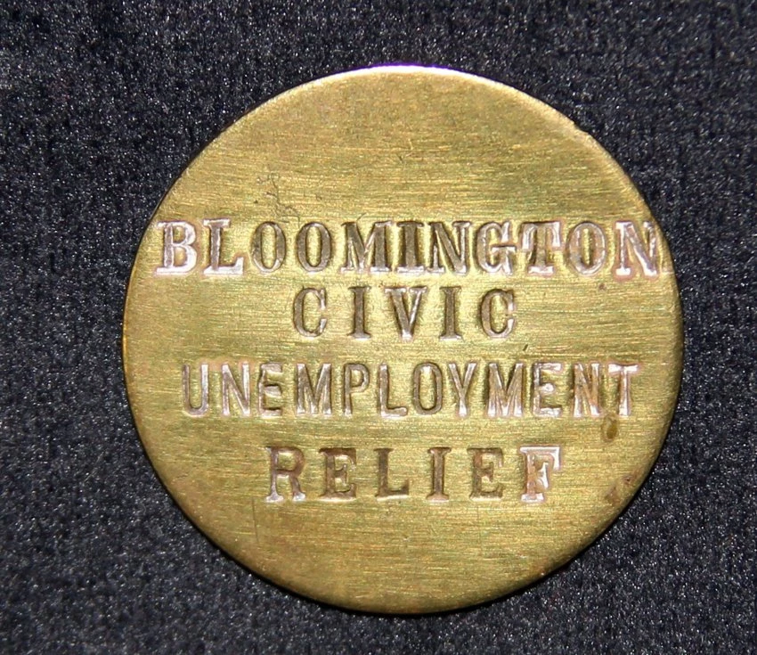 Bloomington’s Civic Relief Office distributed brass tokens and paper scrip that could be used like cash to purchase certain items in local stores. But members of Bloomington’s Unemployed Council objected to the use of scrip because it limited what could be purchased with relief funds.