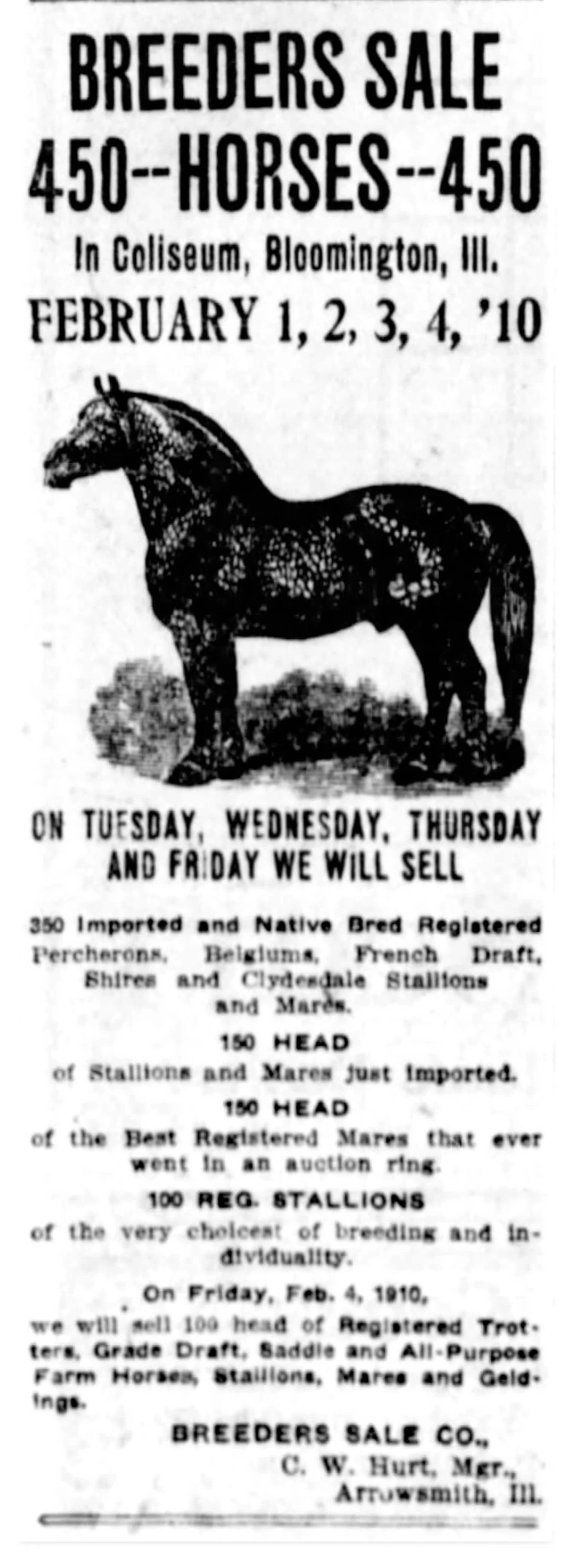 McLean County farmers did not have to go far to buy or sell their horses, as Bloomington was an important regional market for the sale of locally bred horses, as well as horses imported from abroad.