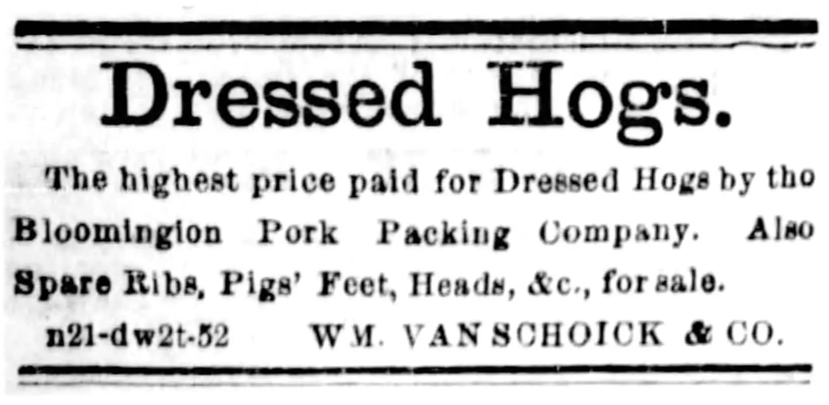 When W.M. Van Schoick opened the Bloomington Pork Packing Company in 1873, many area farmers chose to sell their hogs to his company.