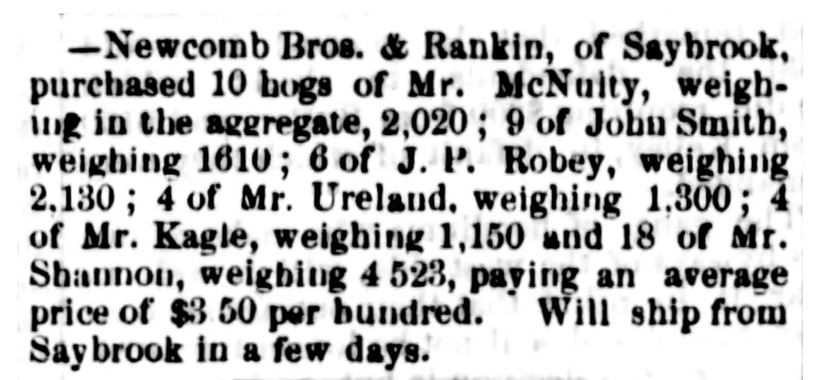 In the winter of 1878 the Newcomb Brothers of Saybrook purchased nearly 200 hogs from area farmers paying about $3.40 per hundred (lbs. of hog). They shipped these hogs to Chicago and grossed an average of $4.25 per hundred.