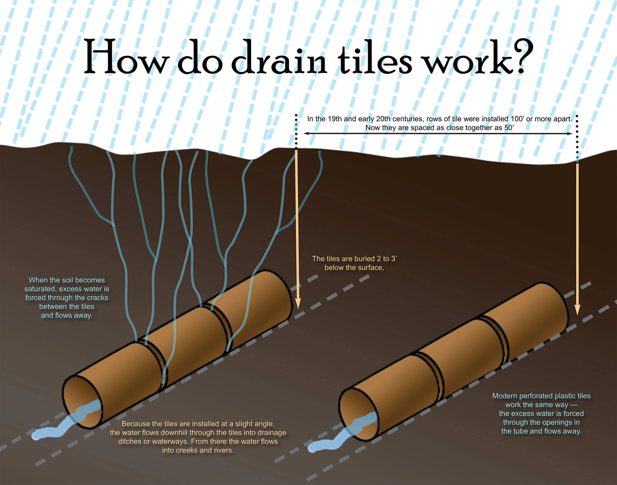 Drain tiles are buried 2' to 3' (0.6 m to 0.9 m) underground. When soil becomes saturated, excess water is forced through the cracks between the tiles and flows away, rather than flooding the fields. Because the tiles are installed at a slight angle, the water flows downhill into drainage ditches or waterways. From there, it flows into creeks or rivers. Modern perforated plastic tiles work the same way.