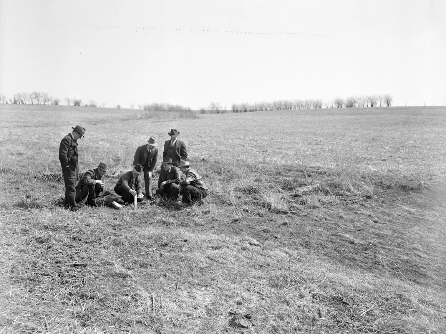 In 1939 C.T. Rodman had a 4.5 foot (1.37 m) deep gully that ran through this field 10 miles southeast of Bloomington and was losing valuable soil every time it rained. With the help of the MCSWCS, the gully was widened and seeded into a 30 foot grass waterway. Three years later Rodman and C.C. Morgan of the MCSWCS examined the waterway after a torrential rain. Though 13 inches of water (indicated on the white stake) had flowed through the waterway, no soil had been lost.