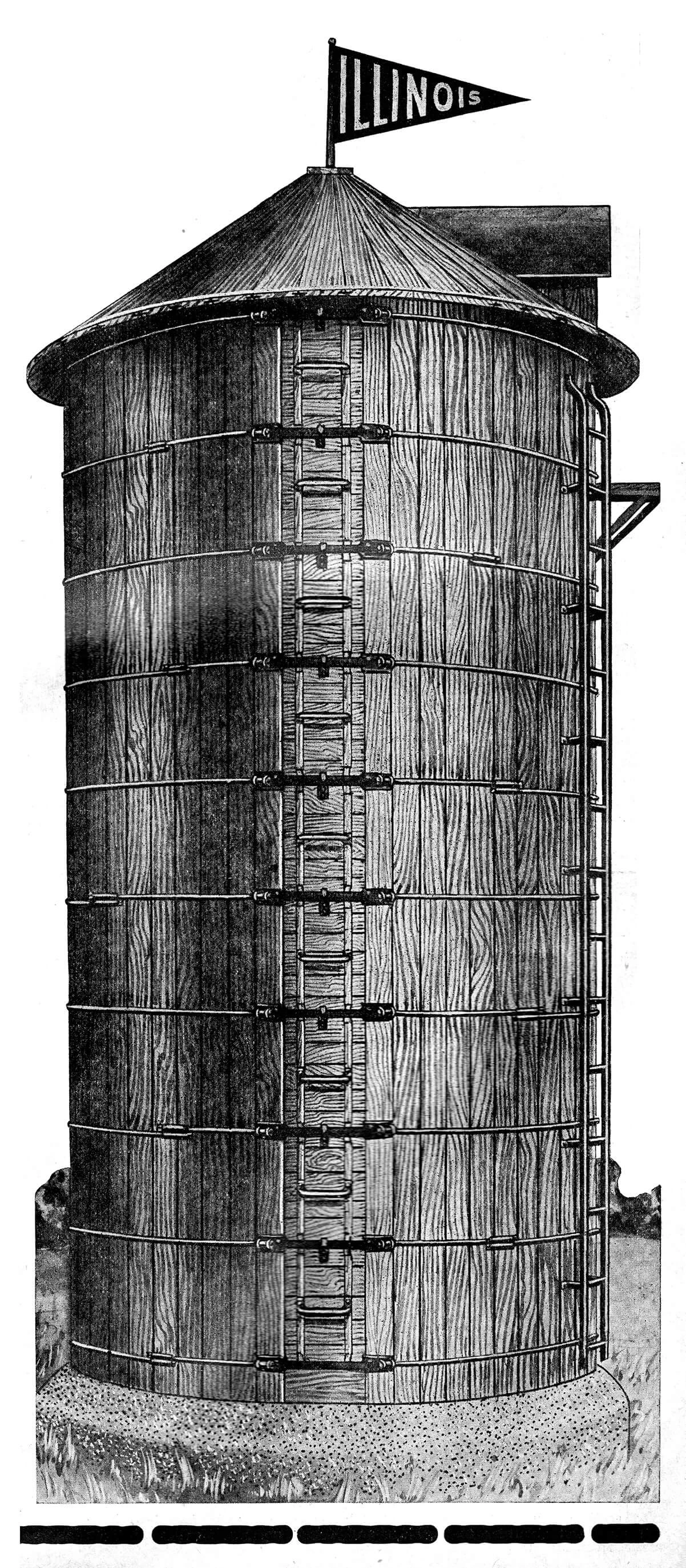 Bloomington’s Illinois Silo Company organized in 1912. The company offered wooden stave silos, like the one in this advertisement, as well as concrete and tile silos.