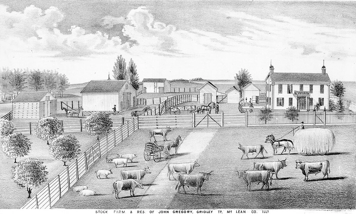 John Gregory purchased 160 acres near Gridley in 1836, and continued to expand the farm and add improvements.