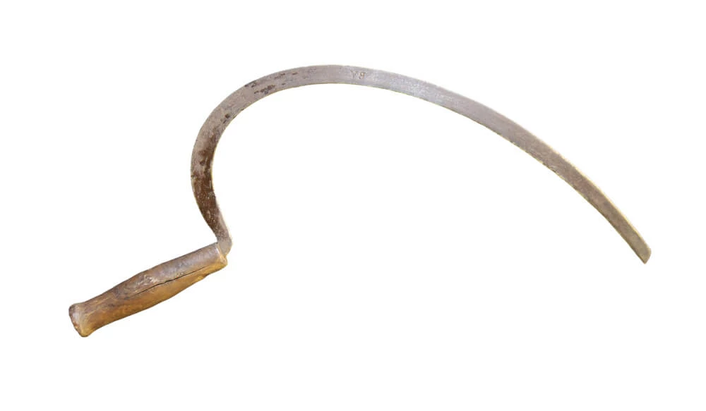 Reaping hooks like this one, which took less skill than a cradle scythe, were also used to cut crops and weeds. This one was used by members of the Orendorff family.