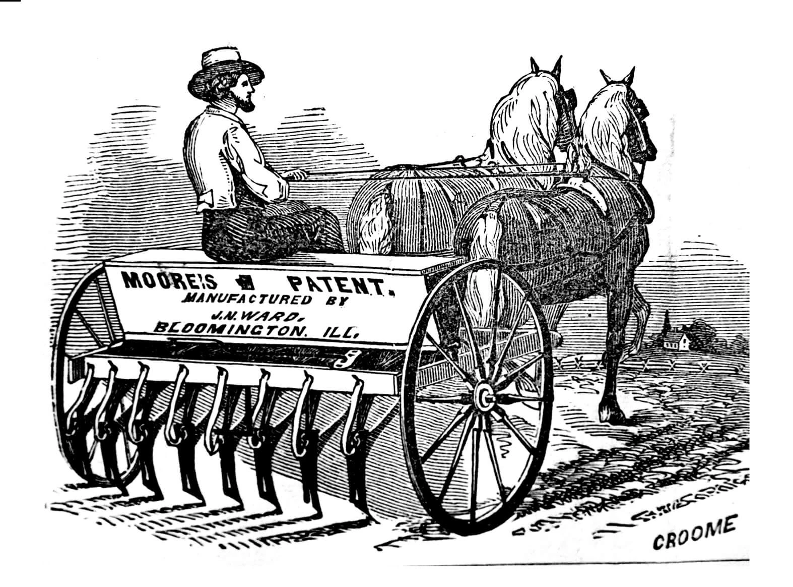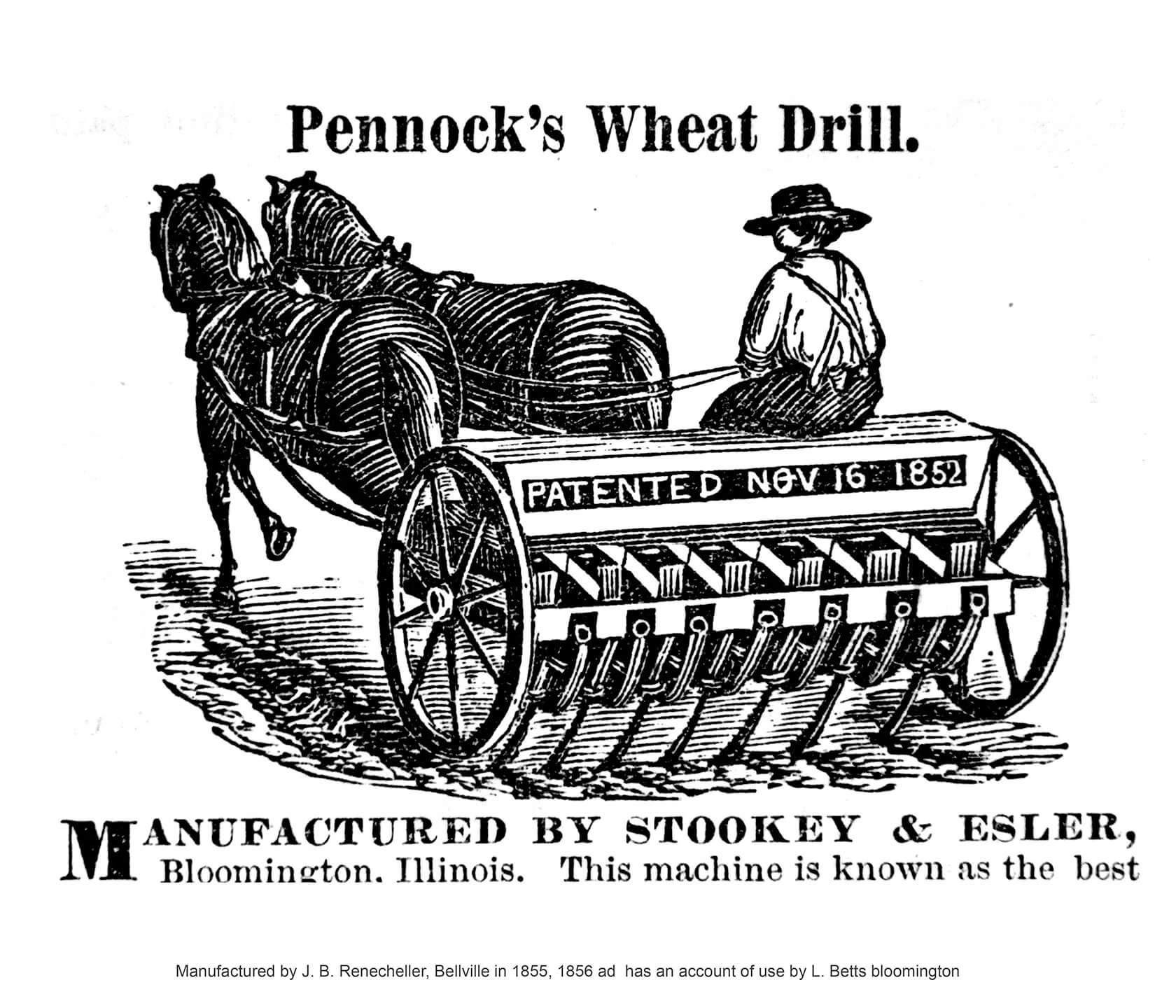 Competition for the sale of equipment was tight in Bloomington — two local manufacturers of seed drills competed for the sale of patented machines. Moore’s sold for $70, but Pennock had an endorsement from L.W. Betts (David Davis’ half-brother) who farmed Davis’ Bellmonte farm east of Bloomington. Betts reported . . .