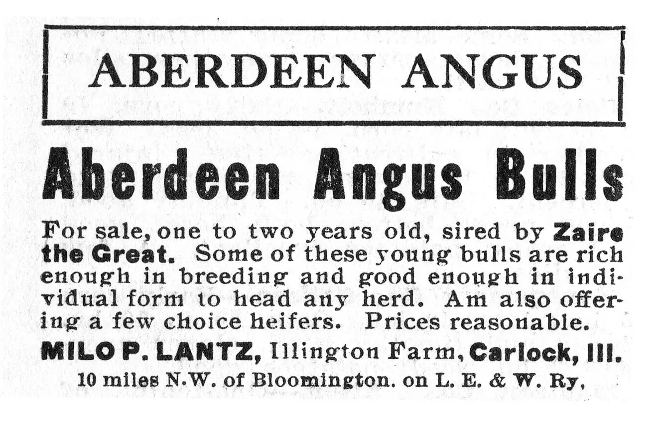 Lantz’s Aberdeen Angus bull, “Zaire the Great,” earned first place at the International Livestock Fair in Chicago in 1905. The award increased the value of his herd of Angus cattle sired by Zaire.