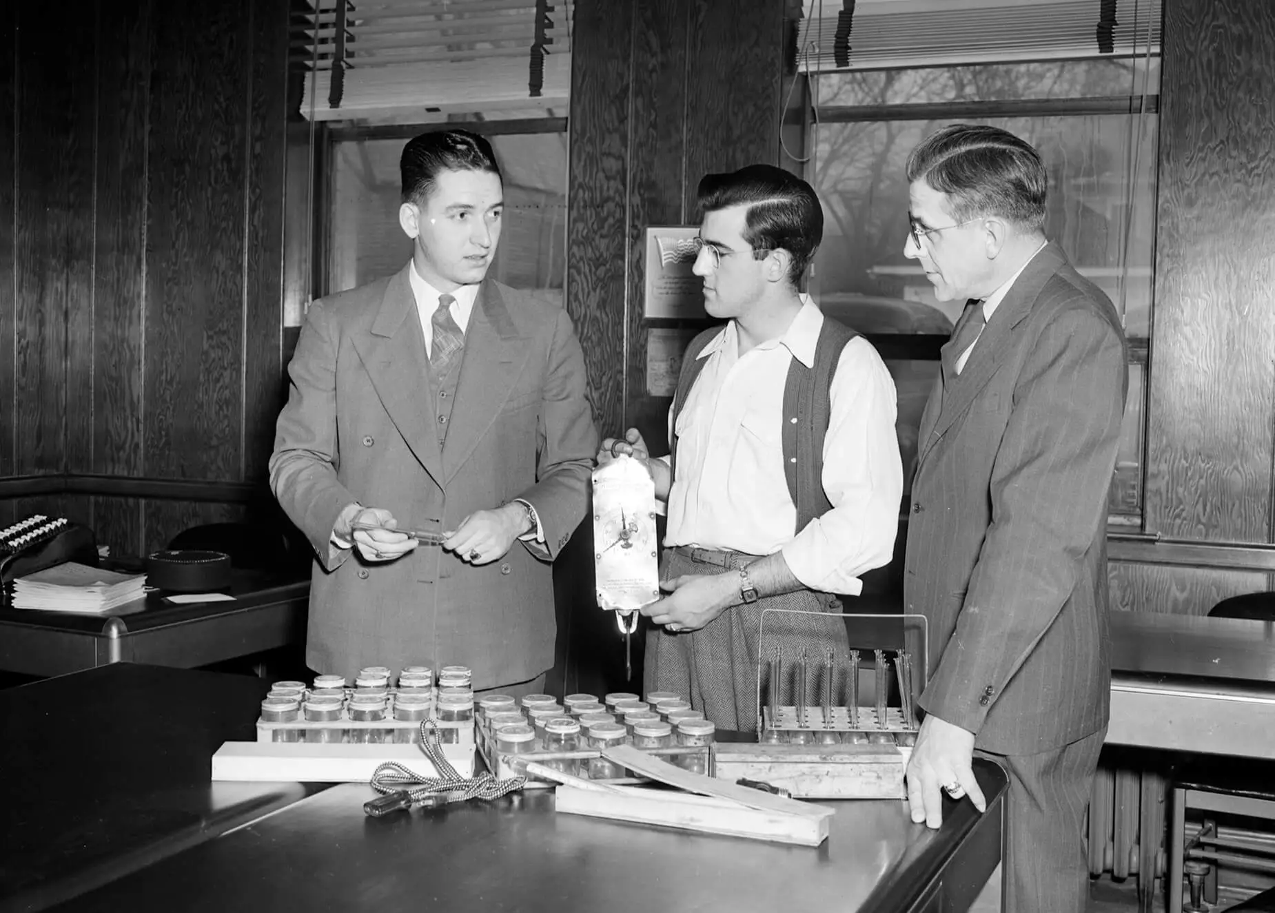 Milk testing bottles, tray, and calipers, circa 1940