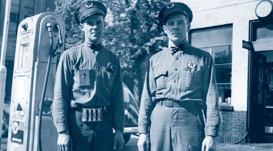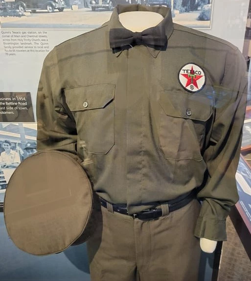 Merchant-to-customer service and interaction declined dramatically as new computer technologies enabled self-service at gas stations and other retail businesses.Featuring:Elmo A. (1902-1976) and Eldon Quinn (1984), Texaco gas station ownersBloomington twins Elmo A. (1902-1976) and Eldon Quinn (1984) opened a Texaco gas station on the corner of Main and Chestnut streets just north of Bloomington’s busy downtown in 1941. Customers came from both directions on Main Street, which was then aligned with Route 66. The brothers pumped gas, checked the oil, and washed the windows for every customer that pulled into their station. They also did mechanical repairs and replaced tires.