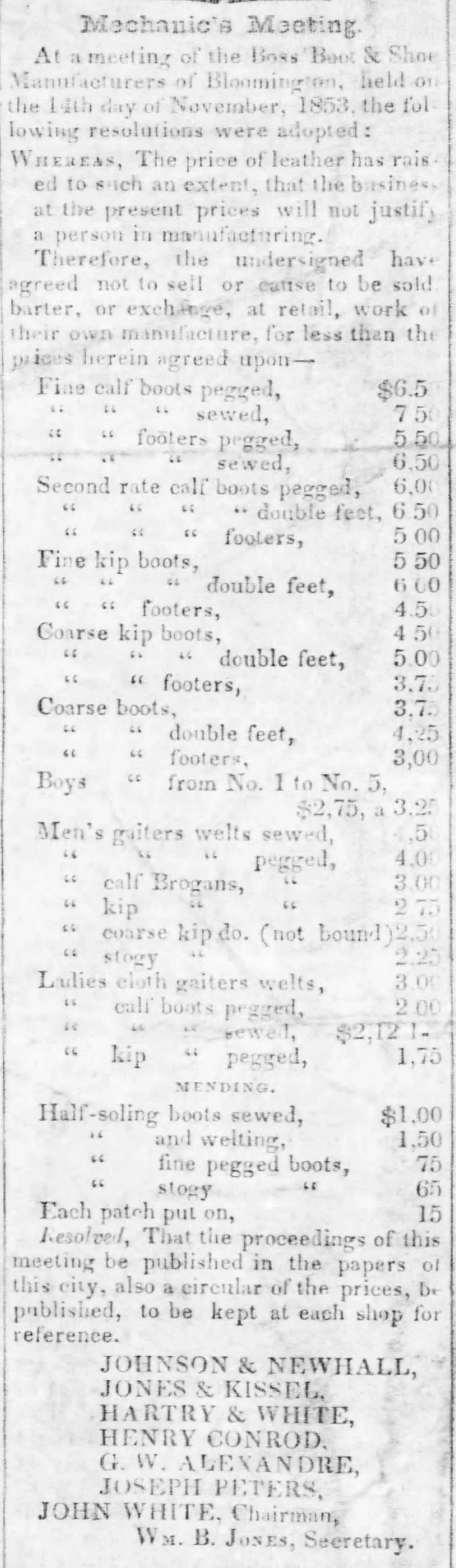 The organization’s goal was to ensure they could all make a living. They did this by agreeing on specific prices for their products, which they published in the Pantagraph. With fixed prices in place, competition depended upon the quality of the materials used and the skill of the shoemaker.