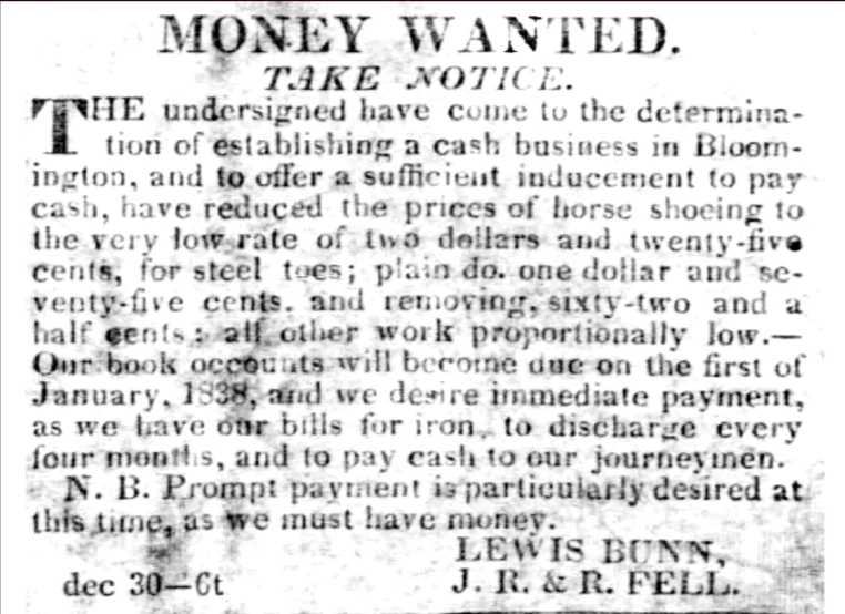 Ohio native Lewis Bunn (1806–1886) was Bloomington’s first trained blacksmith, having moved to Bloomington in 1833.