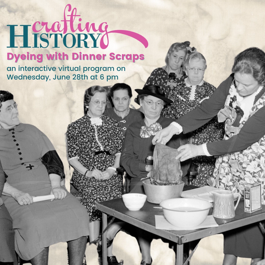 Our next Crafting History will be on June 28th at 6pm. Crafting History: Dyeing with Dinner Scraps will bring the process of solar plant-based dyeing virtually to our participants. Our Curator of Collections, Jackie Cain, will bring her expertise in historic dyeing and textiles to Crafting History.
