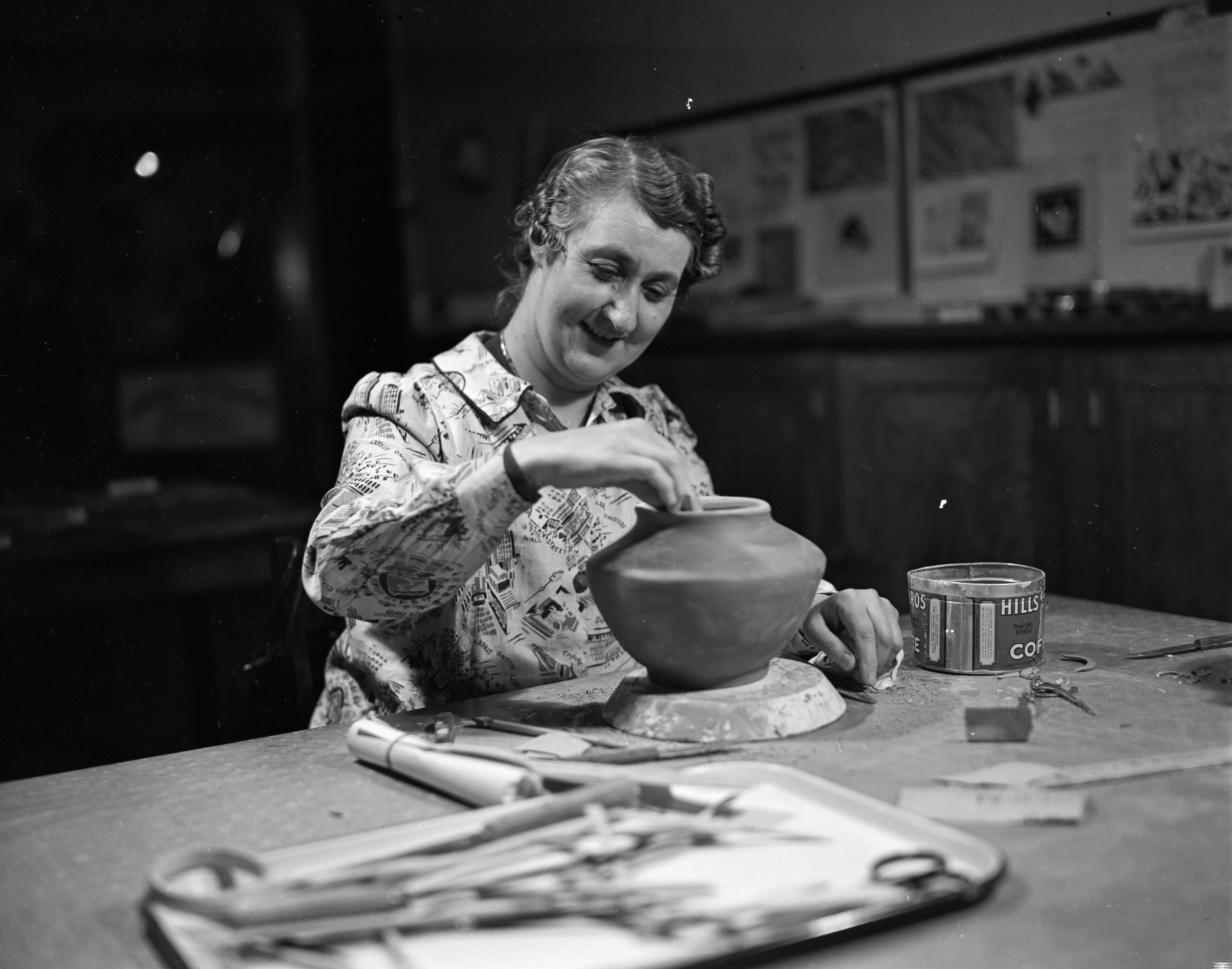 Photo Caption: Miss Elizabeth Shea, art instructor at Raymond School, puts the finishing touches on a ceramic creation at the recreation studio, formerly located at 214 N. Madison St. in Bloomington. This photo from March 1940 has been preserved and digitized by the McLean County Museum of History as a part of our Pantagraph Negatives Collection. Click here to learn more about how we're saving y(our) history.