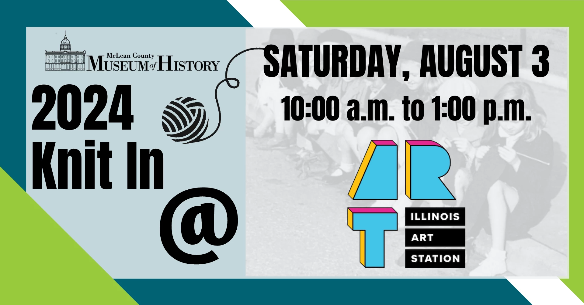 The third Knit In for 2024 will be Saturday, August 3 from 10:00 a.m. until 1:00 p.m. at Illinois Art Station. This event will be held on the patio at the Art Station (please bring a lawn chair to sit on. If inclement weather, the event will be moved indoors). Knitters and crocheters are welcome to come and create charity items or work on their own projects in the company of like-minded crafters.