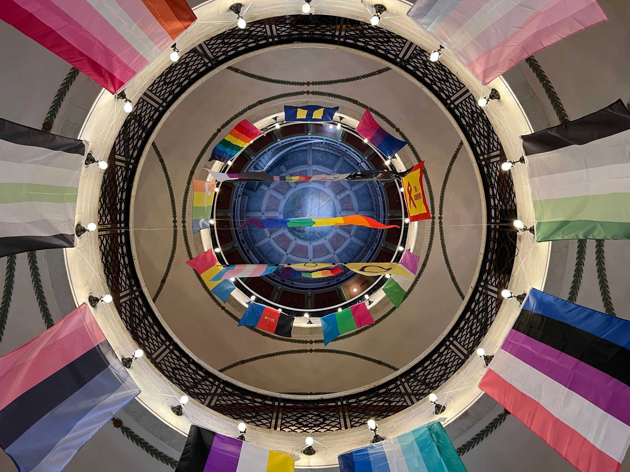 The 27 flags hung in the Museum's Rotunda represent a selection of gender and sexual identities within the broader LGBTQIA+ community and feature notable flags from social movements and historic moments in the fight for equal rights.