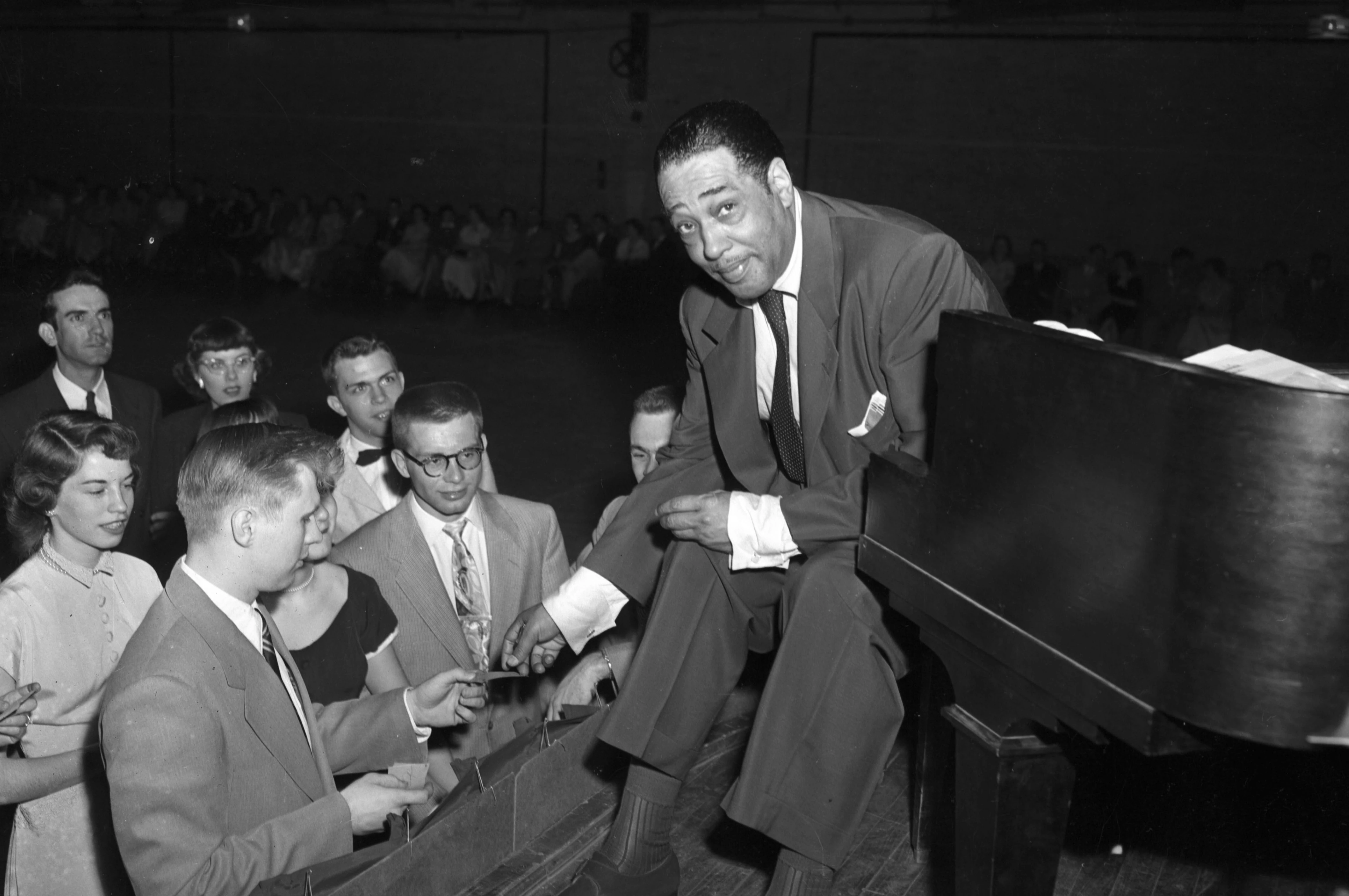 “The Duke was on his feet nearly as much as he was at the piano,” observed Pantagraph reporter Dave McClelland. “He would softshoe through some numbers, his arms in perpetual motion. He directed the band with his head, his shoulders, his elbows, and at times even his eyebrows.”