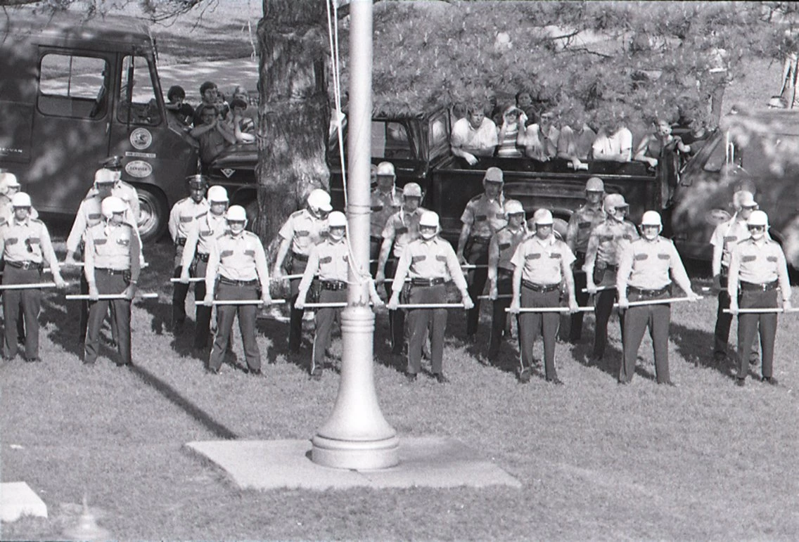 Tensions increased again on Tuesday, May 19, when a group of construction workers raised the flag, which was supposed to be at half-staff for Malcolm X’s birthday. In response, ISU officials lowered the flag and ringed the flagpole with university vehicles. Braden, who stood inside with 44 ISU police officers and sheriff’s deputies, told the “hard hats” that anyone venturing inside the cordon would be arrested.