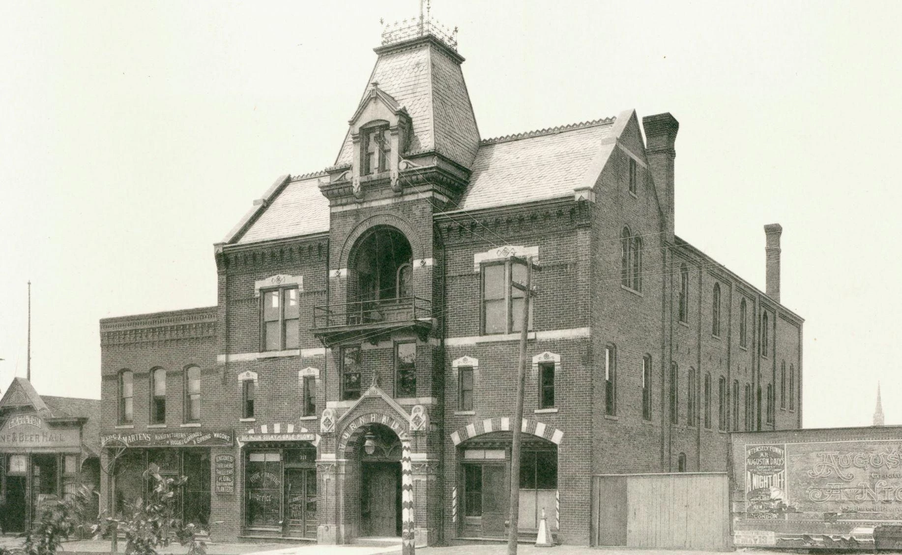 Turner Hall’s formal dedication took place Monday evening, December 10, 1883. The program kicked off with a torchlight procession of some 100 Turners and their supporters marching from downtown to their new home. Most of the dedicatory speeches were in German. “Believe me,” declared Turner president Christian Riebsame, “that while we love to cherish the memories, the habits and customs of our fatherland, and cling with revered fondness to our mother tongue, it is our aim and ambition at all times to be as good citizens of the land of our adoption as it is your pride and glory to be Americans to the manor born.”